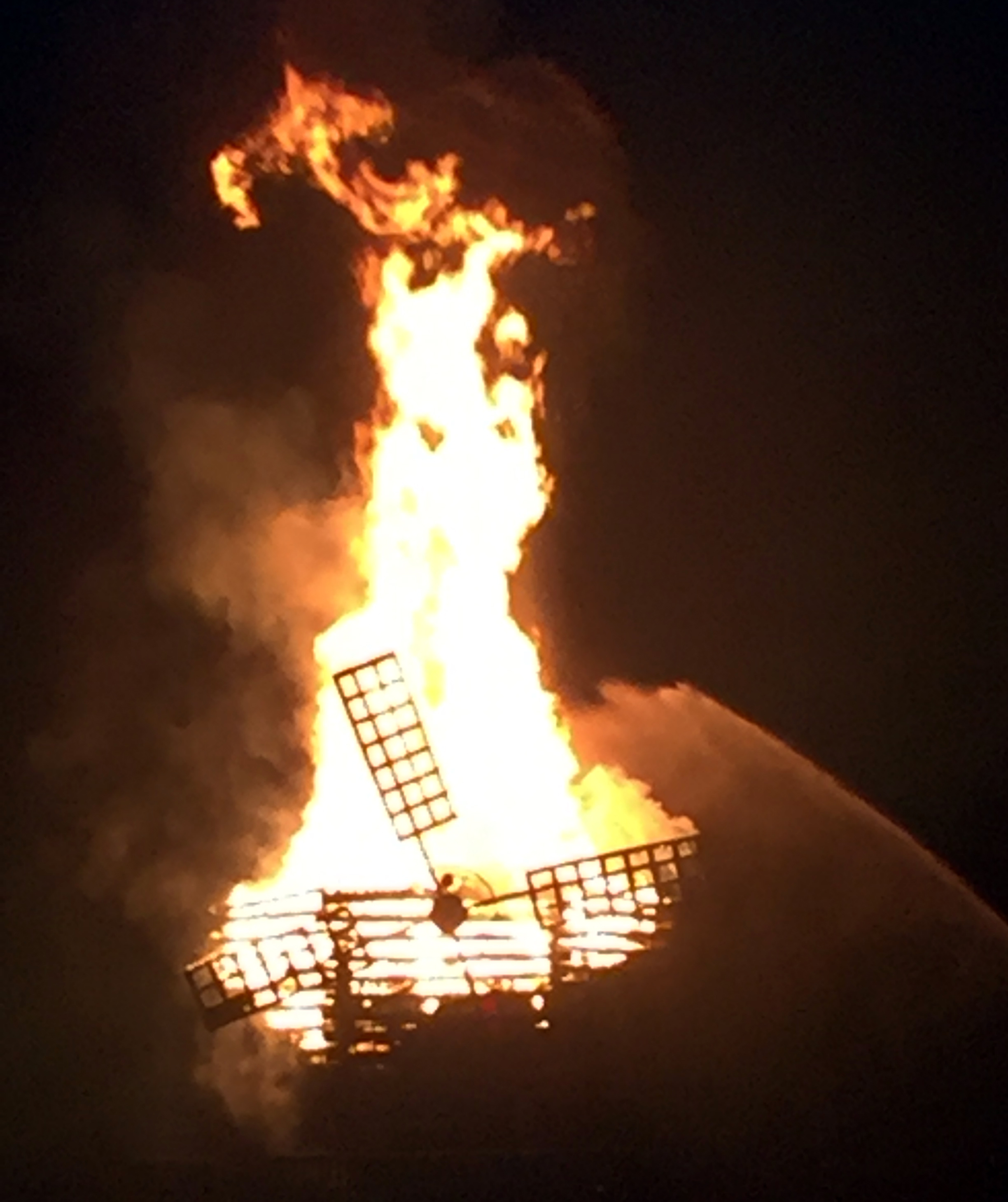 Först syntes bara några försiktiga strimmor eld från mitten av väderkvarnen. Men sedan spred den sig till ett dånande och sprakande inferno av eld som raserade många hundra timmars frivilligbyggande på ett på ungefär den tid det tog att stå i kö för nästa öl.