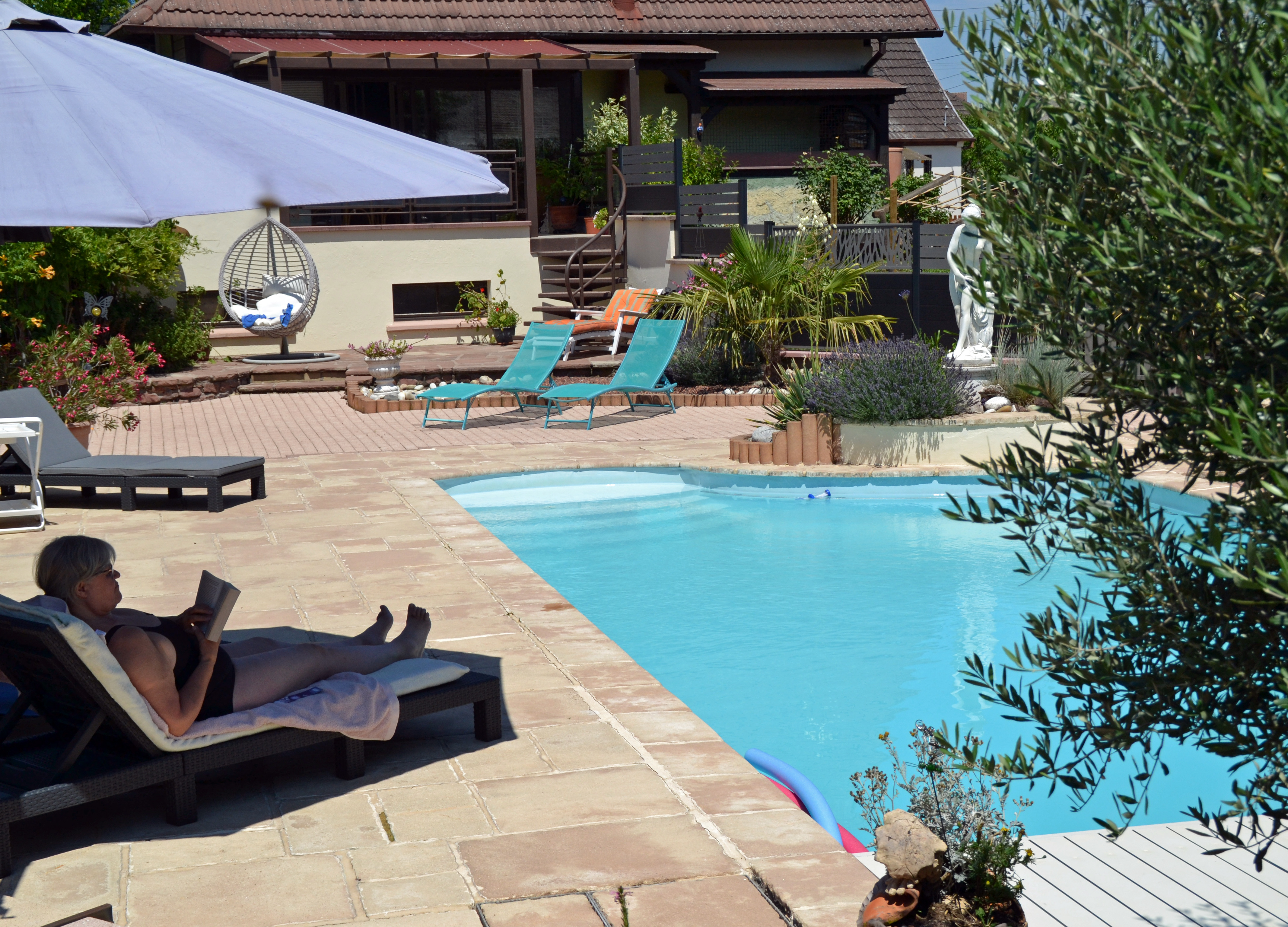 Svepte in oss i en badhanduk och följde med till poolens utekök, döpt till Place de la Bière. Där hällde värden upp fatöl åt oss och slog sig ner för att prata. Samtalet var på högtyska – alltså sådan som man lär sig i skolan – och i så långsamt tempo att även jag kunde delta. Men deras modersmål är elsassiska, alltså den sydtyska dialekt som man traditionellt pratar i Alsace.