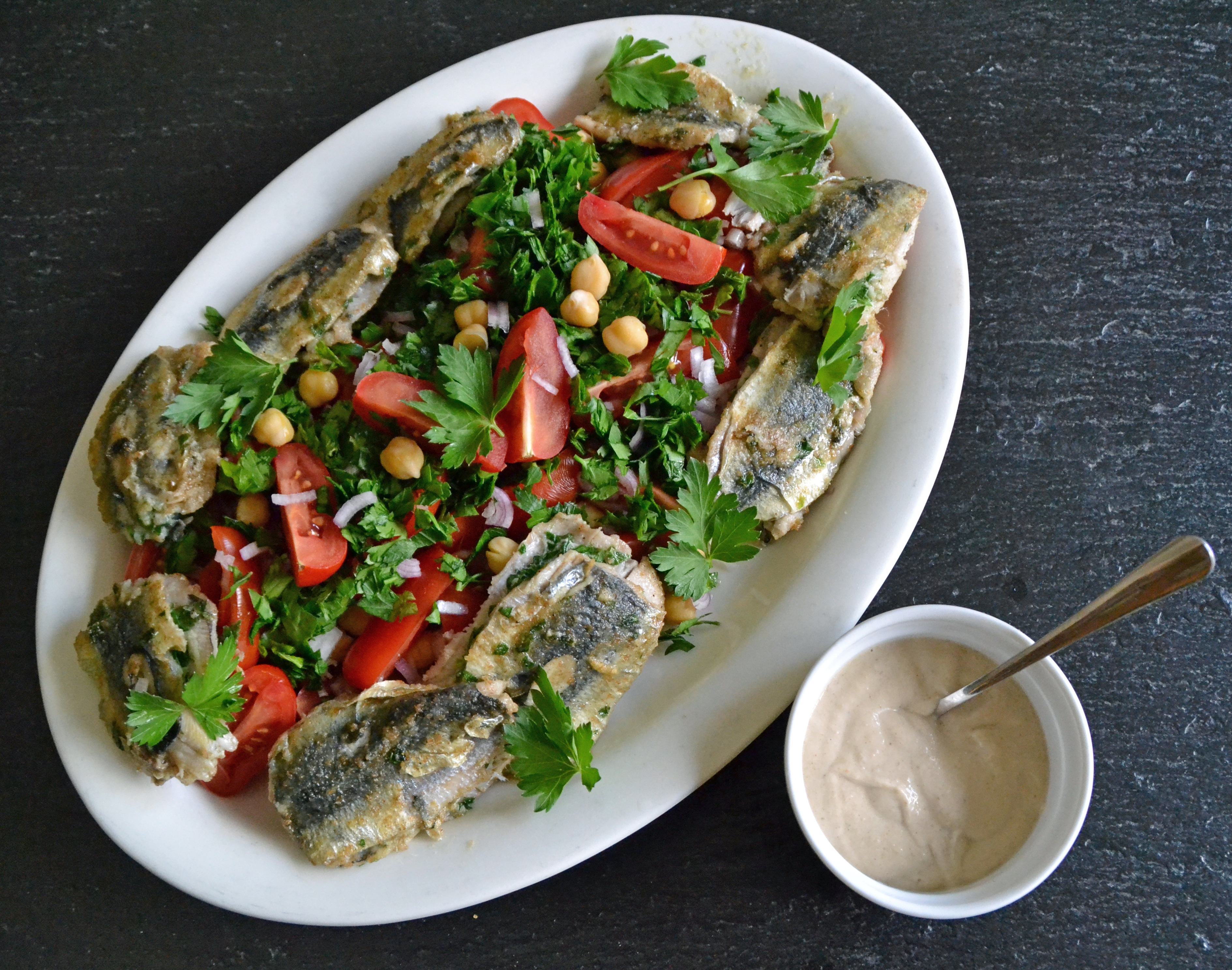 Ett väder där en ljummen sallad med kikärtor trivs med strömming som fått en smakskjuts av vitlök och persilja. Ät salladen med tahinisås om du gillar den lite sträva sesampastan. Annars är det gott med en vanlig vinägrett.