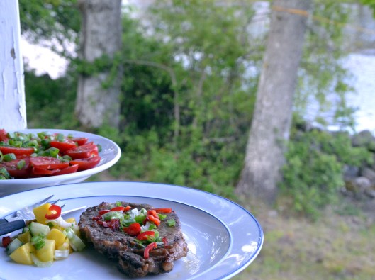 Här kommer det i alla fall, receptet. Grillad lammstek som först marinerats i vin och örtkryddor.