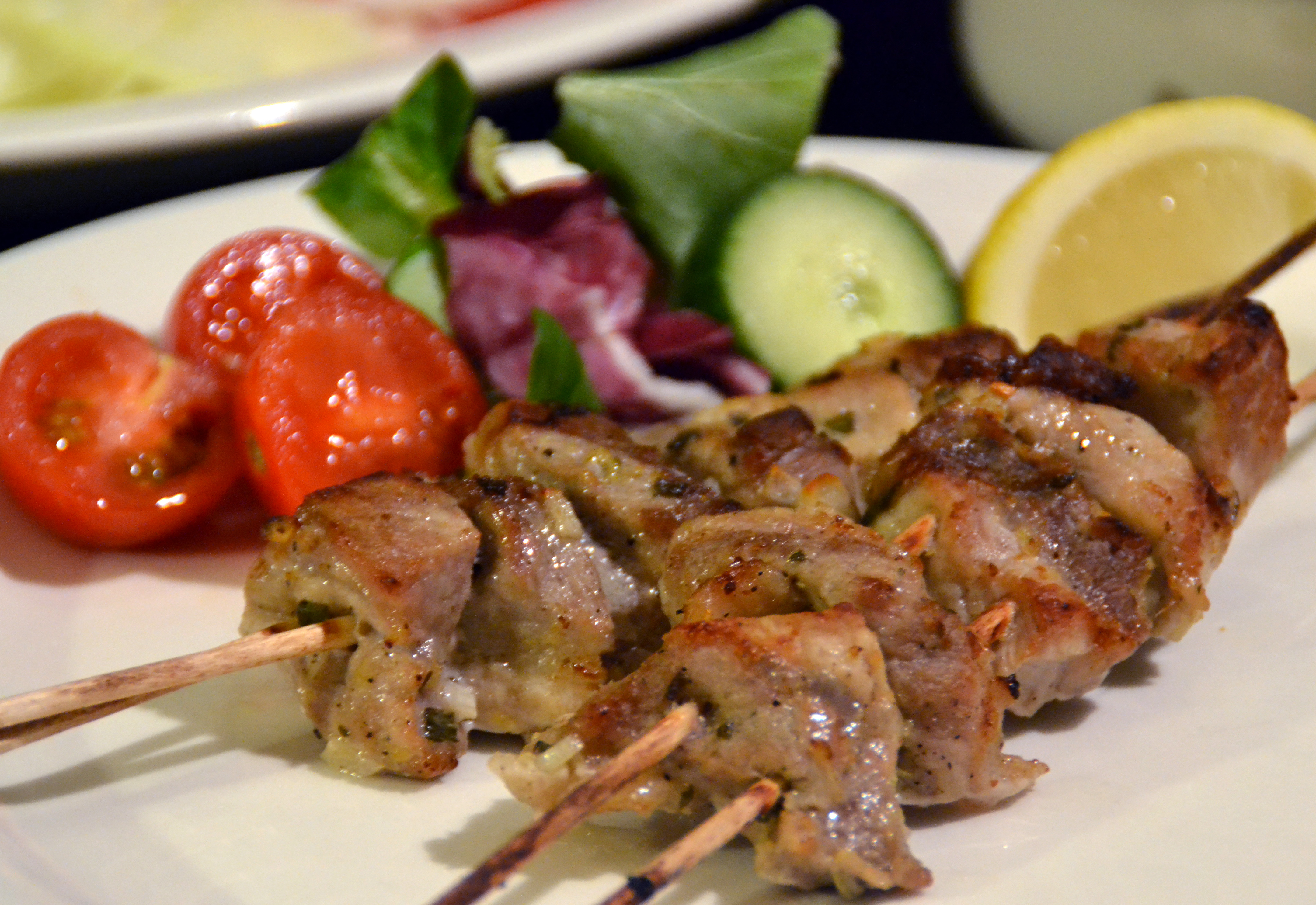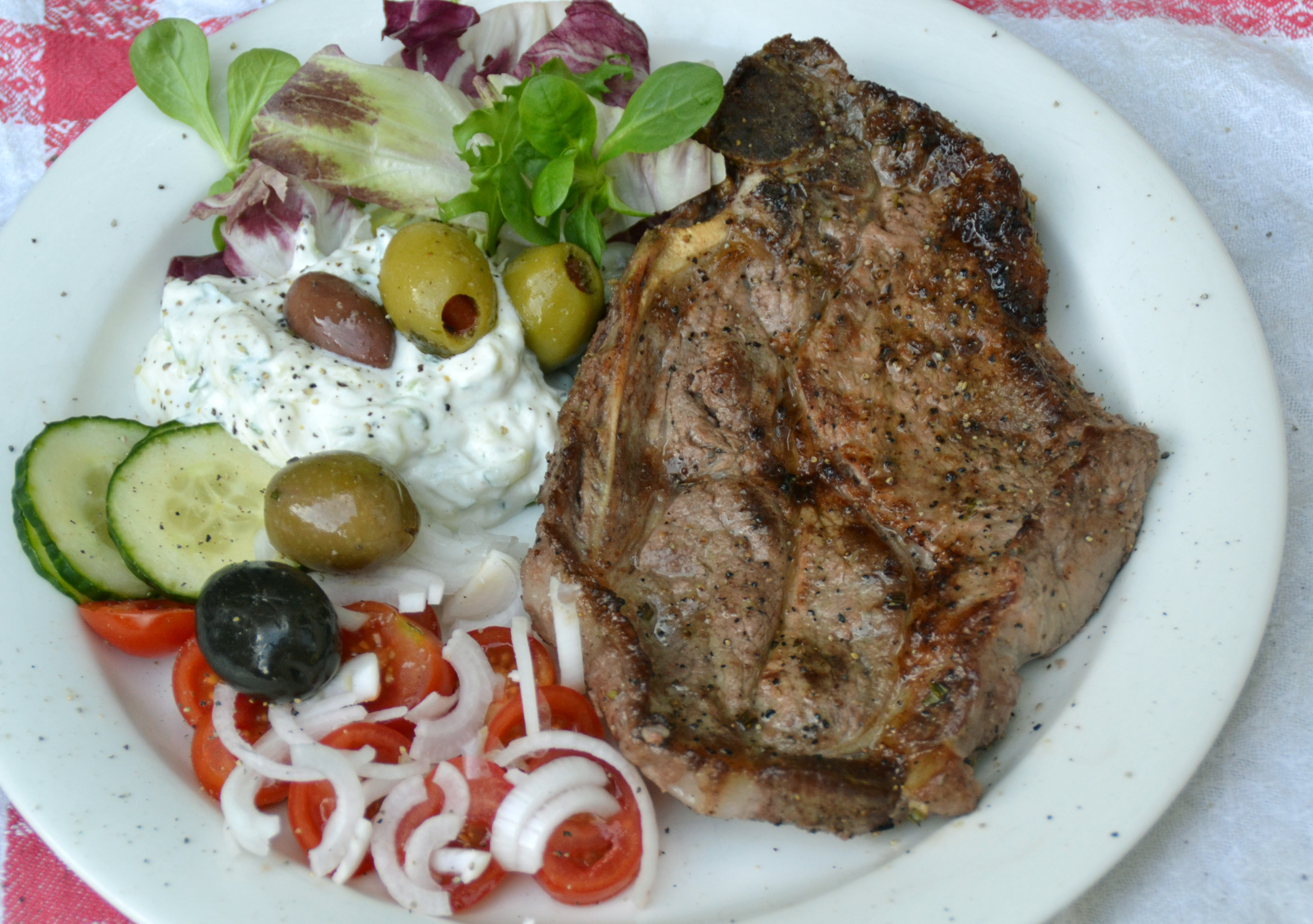 Hade vi haft mer tid, så hade vi lagt burgarna på grillen. Nu fick de en tur i stekpannan istället. På tallriken fick de sällskap av klyftpotatis, Kikärtstagine och turkisk yoghurt.