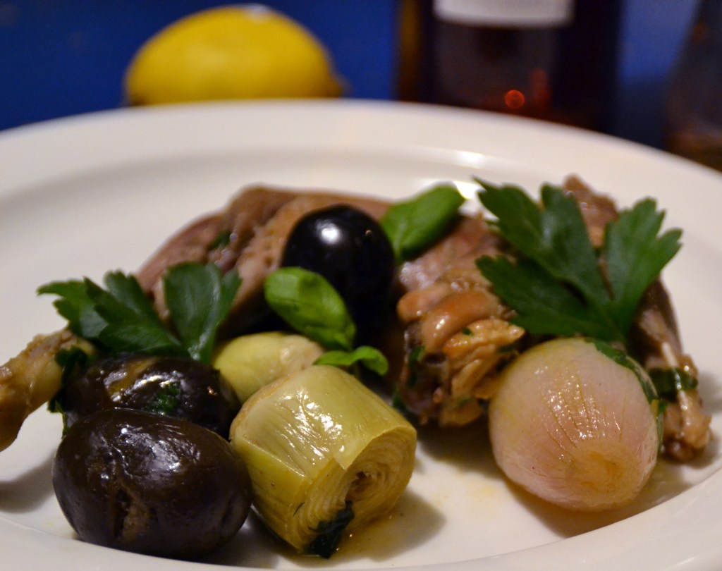 Låt grytan koka 30 – 35 minuter tills kycklingköttet är helt vitt och grönsakerna klara. Lägg i oliverna mot slutet.