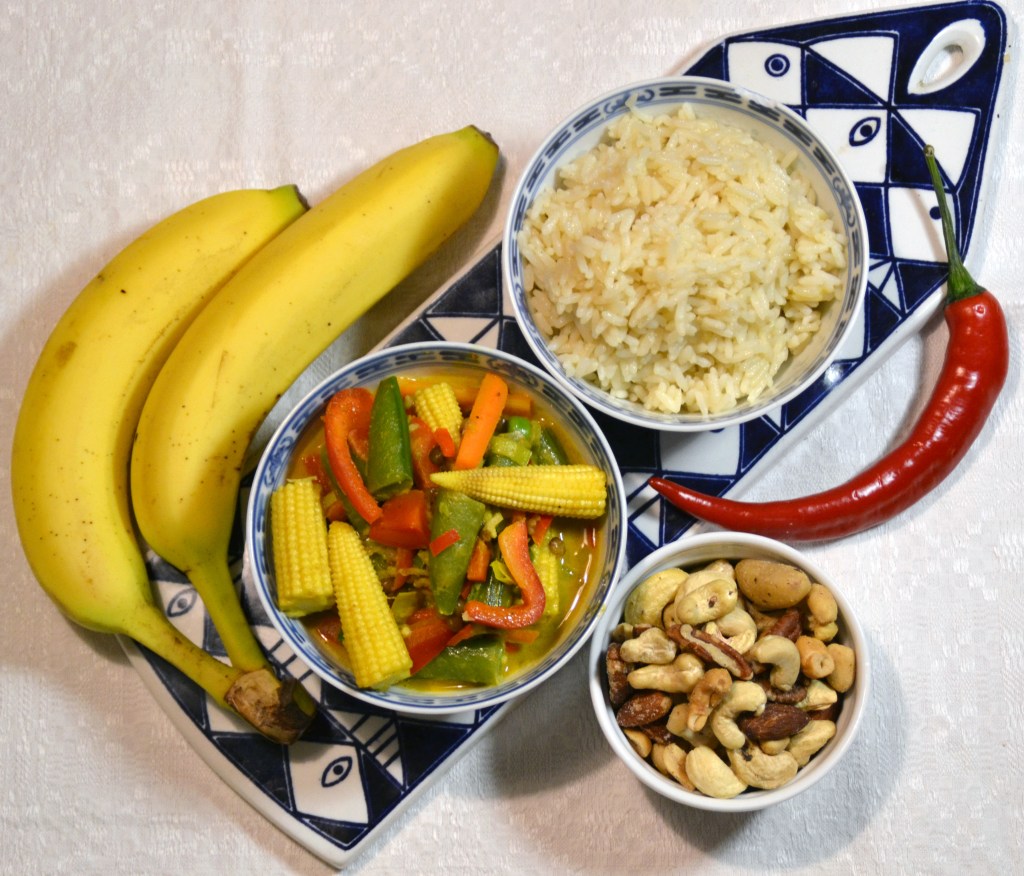 Och så lite asiatiskt: Om du nu sitter och längtar efter andra smaker, så kommer två förslag. Fried rice med spetskål, champinjoner & stekt ägg och grönsakscurry currymed linser, nötter &banan