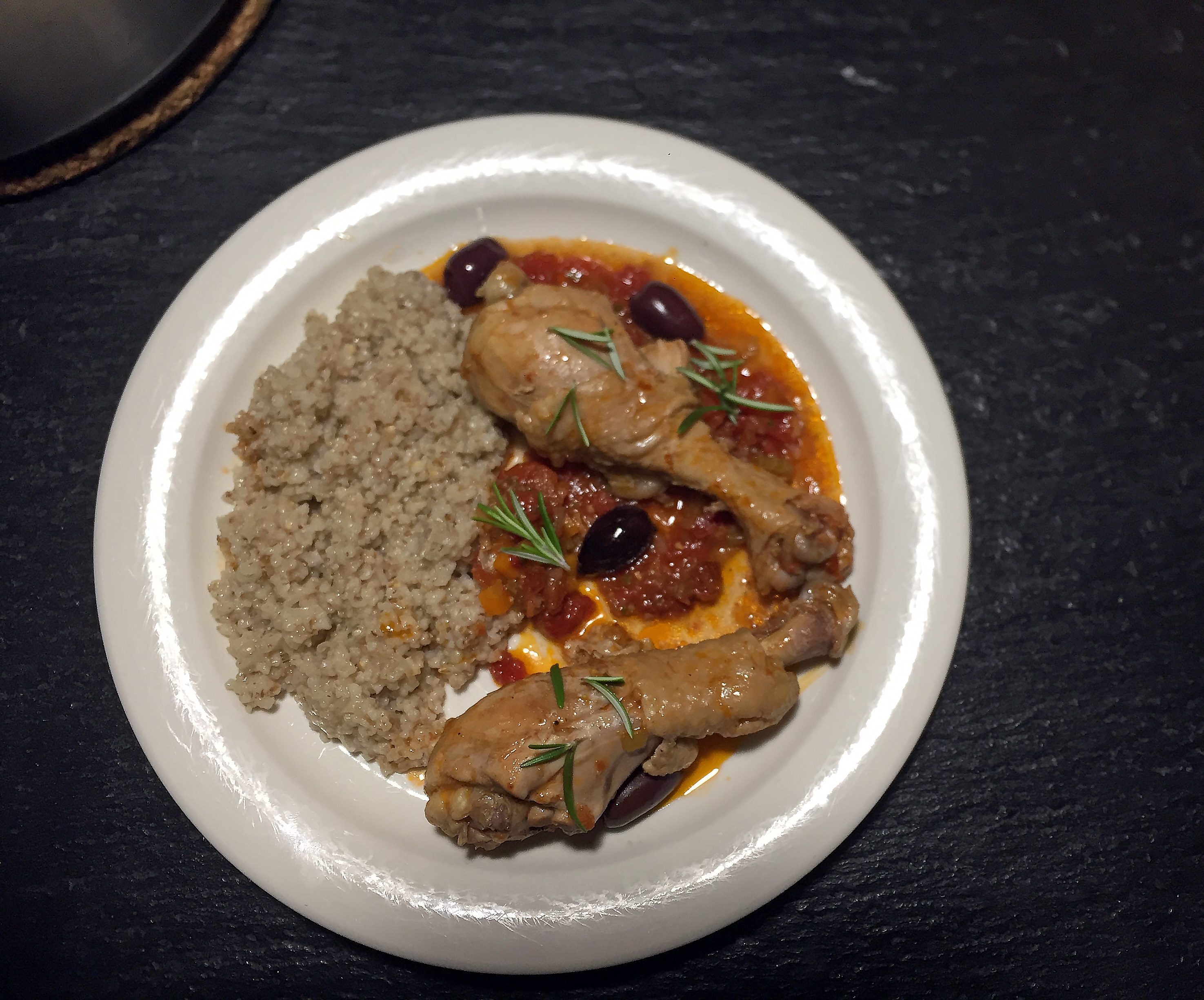 Värm olja i en gryta. Fräs kycklingbenen så de får lite stekyta, salta & peppra. Lägg i lök, selleri och morot och fräs tills löken börjar bli glansig. Tillsätt tomaterna (enklaste sättet: klipp sönder dem med en sax), soltorkade tomater, rosmarin och så mycket kycklingbuljong att det nästan täcker. Pressa i vitlöken.