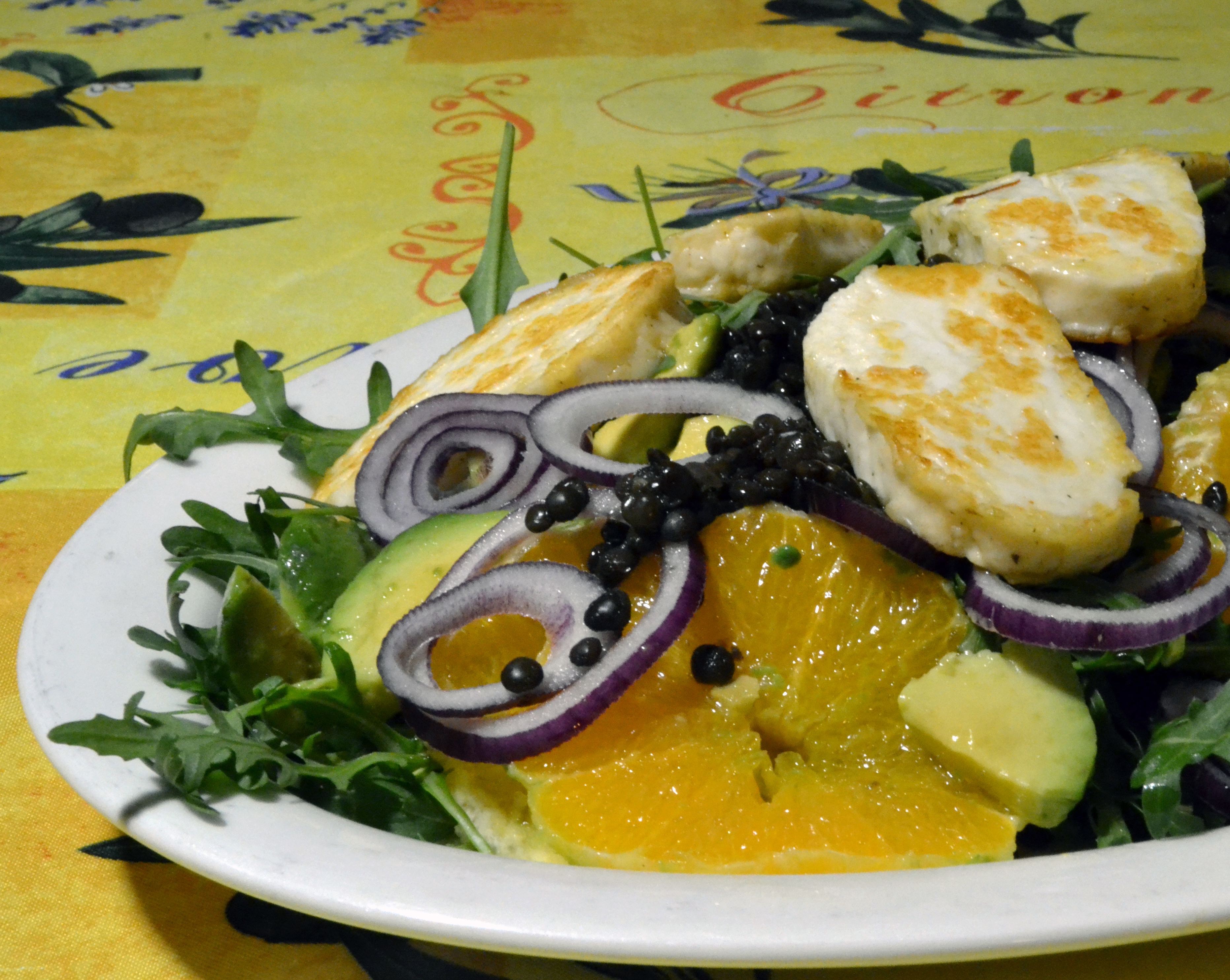 Nu är apelsinerna som bäst. Här bryter de fint mot halloumins sälta. Linser adderar fyllighet och så bygger man på med lite avokado, lök och ruccola.