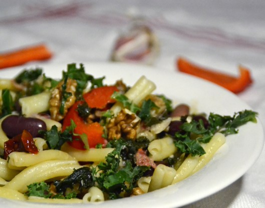 Pastasås med grönkål, paprika och crème fraiche. Och så bönor som ger fyllighet och valnötter som adderar crunch.