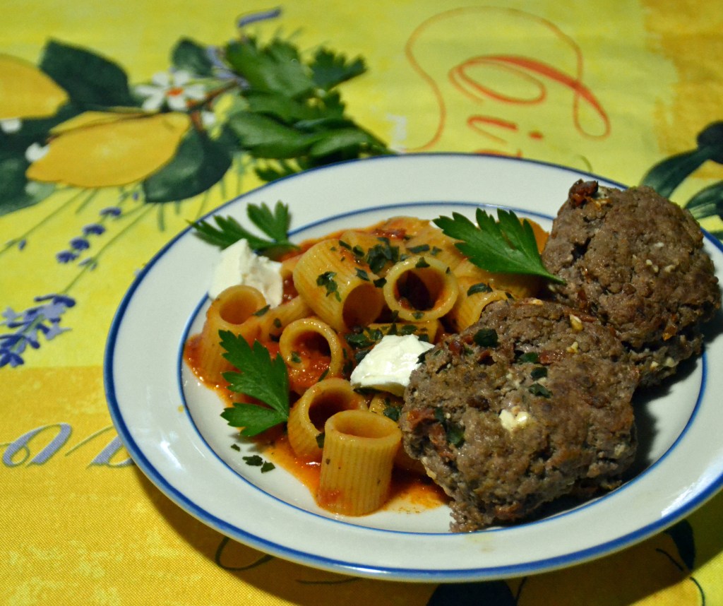 Jag tyckte det var lite svårt att få köttfärsbiffarna att hålla ihop under stekningen. Någon gång ska jag testa att forma köttfärsen till biffar och så stoppar jag in blandningen av feta och soltorkade tomater i mitten. Lite som man gör med kroppkakor – men plattare.