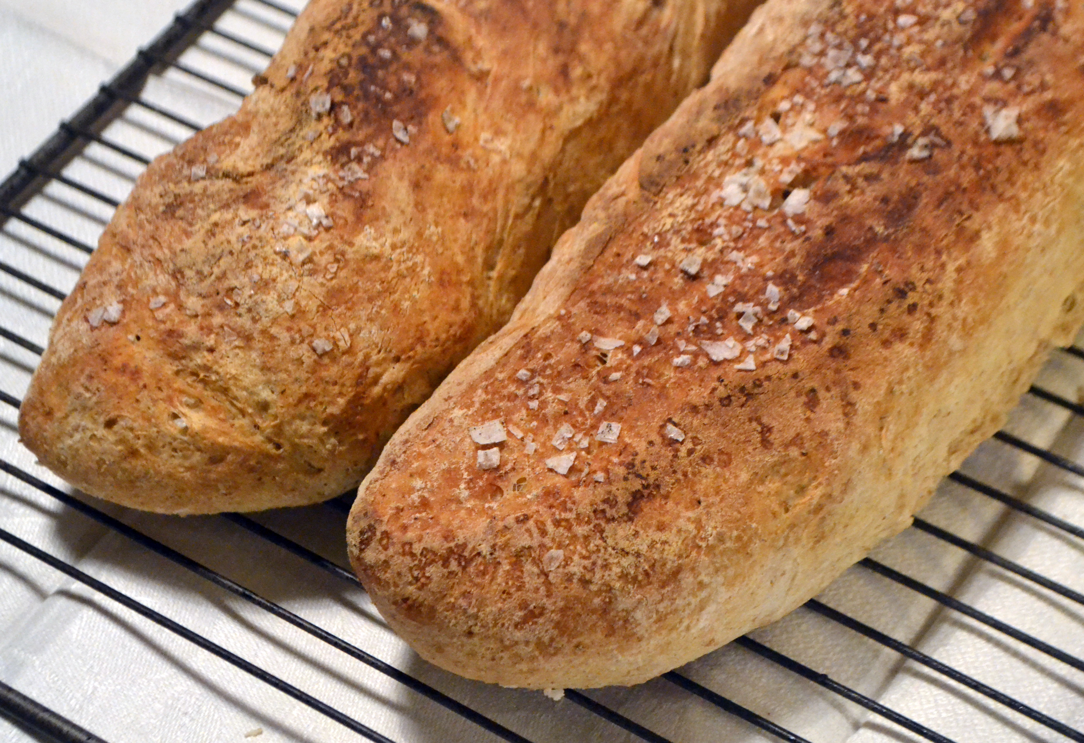 Sätt ugnen på 225 grader. Låt degen jäsa på plåten i 30 minuter. På slutet tar man en vass kniv och gör några snitt i degen, så att det blir öppningar i brödet. (Den som är konstnärlig fixar ett snyggt mönster. Min deg såg ut som när en treåring försökt skära ut en halloween-pumpa…) Pensla brödet med olja och strö över flingsalt.