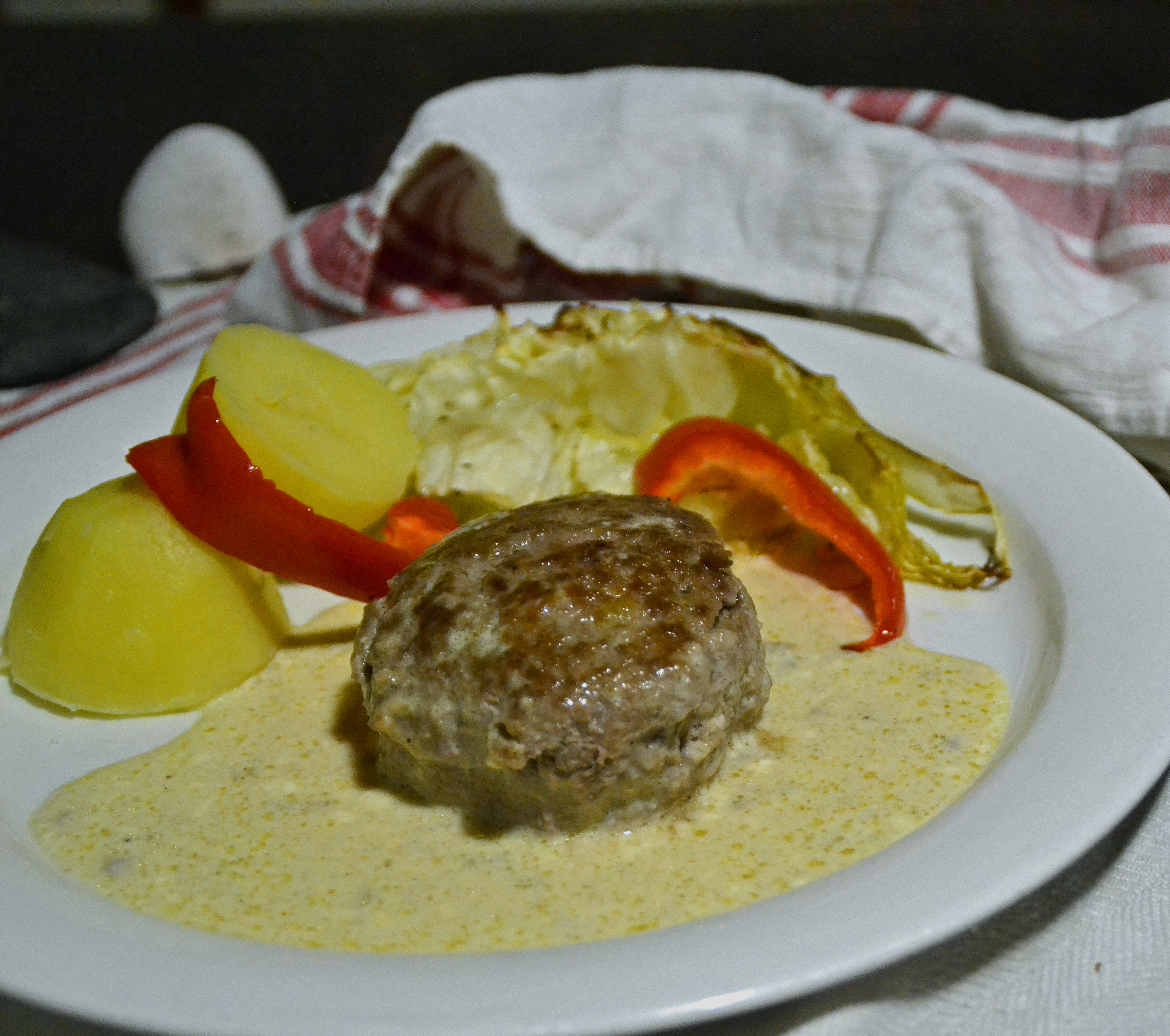 Tänk att något så enkelt kan vara så gott. Man tar lite köttfärs, kryddar den och formar till biffar. Tar fram stekpannan och låter biffarna få färg. Häller på lite vatten och grädde och låter allt koka ihop ett par minuter.