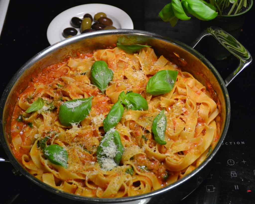 Pastasåsen. Fräs löken glansig i olja. Salta & peppra. Tryck i tomatpuré och fräs en stund till. Häll i passerade tomater och vatten. I med vitlök & rosmarin. Låt tomatsåsen koka 15 – 20 minuter. Skrapa ner paprikan så den får koka med såsen i 5 – 6 minuter.