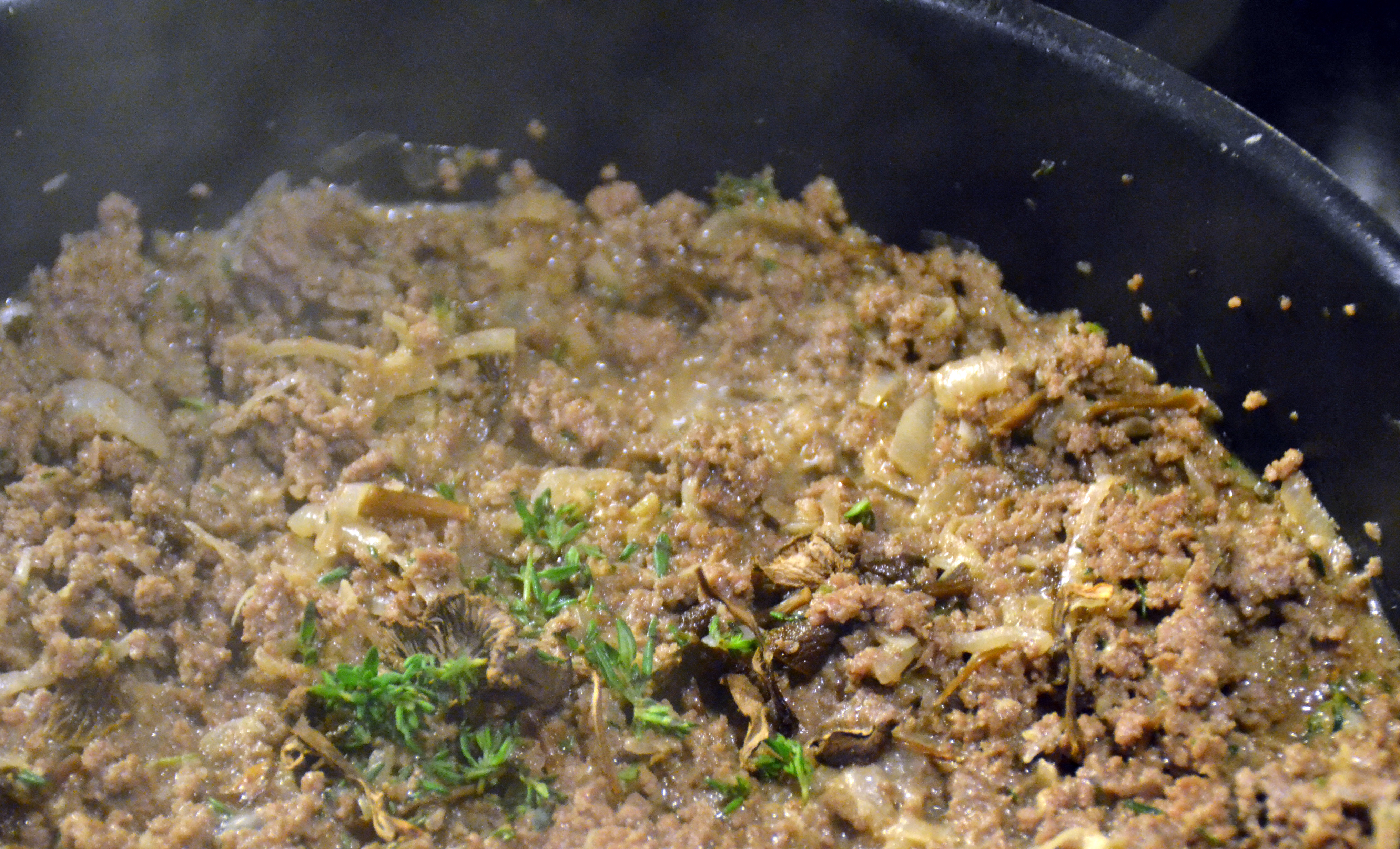 Bland vildsvinsfärsen med ägg, timjan, salt, svartpeppar & pressad vitlök. Använd trägaffel eller händerna. Stek en liten klick och kolla så smaken sitter som den ska.
