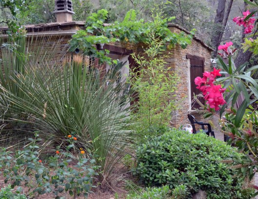 Man kör två kilometer upp från Medelhavet strax öster La Ciotat. Följer en väg som slingrar sig efter en uttorkad bäck. Vid nummer 230, Chemin de Civade Verde (som med fransk oordning gränsar till nummer 166) ligger Gites & Chambres d’hôtes L’Oustalet med två små hus till uthyrning. Ett av dem kallar värdparet för The Shed, alltså skjulet, och det blir vårt provencalska kryp in.